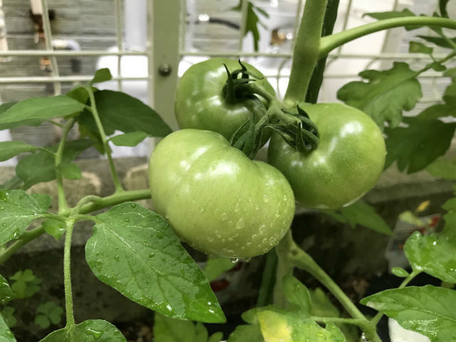 大玉トマトは、ムクムク大きくなっていますが、まだまだ赤くなる気配なし。
